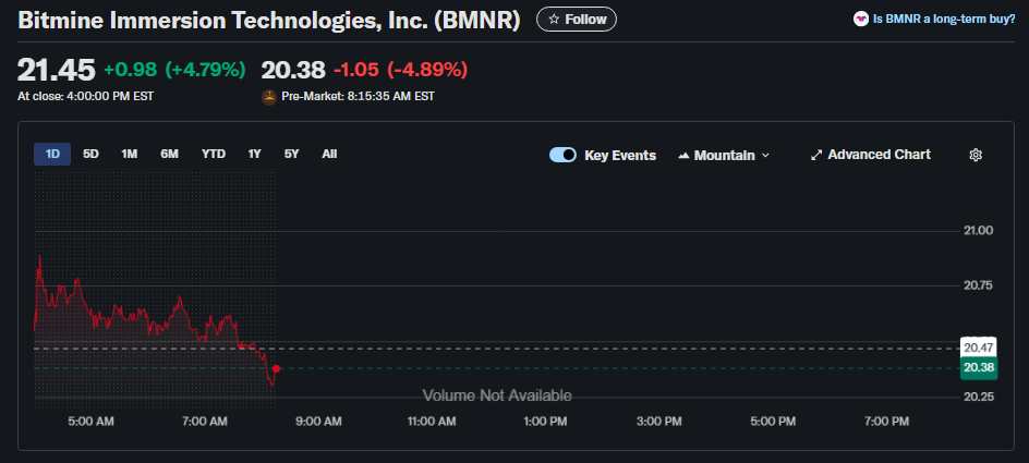 BitMine’s aggressive buying did not calm all investors. News outlets tracked a drop in the company’s stock (BMNR), which was reported down roughly 5% in pre-market trading around the same time the ETH buy was disclosed.