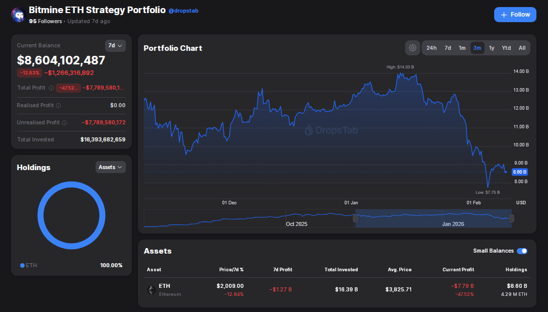 BitMine faces an estimated $7.7 billion paper loss on its ETH holdings. Source: DropsTab